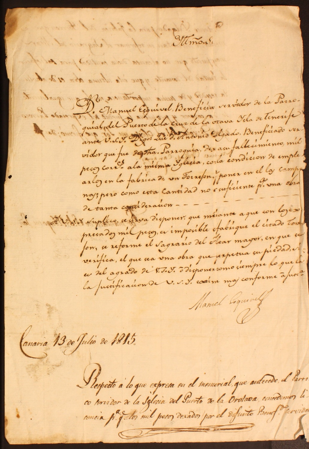D. Manuel Esquivel, Beneficia servidor de la Parroquial del Puerto de a Cruz de la Otava Ysla de Tenerife ante V.S.Y Digo: Que D. Antonio Delgado, Beneficiado servidor que fue de dha. Parroquia, dejo a su fallecimiento, mil pesos corr(.) a la misma Yglesia, con la condición de emplearlos en la fabrica de un Torrefon, pa. poner en el las campanas; pero como esta cantidad no es suficiente pa. una obra de tanta consideración.
