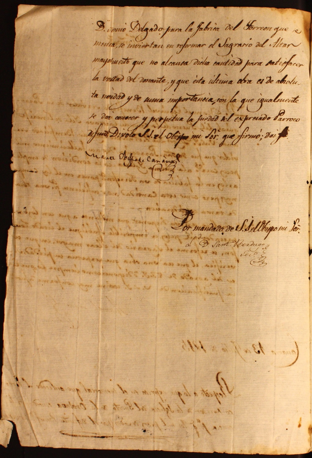 Respecto a lo que expresa en el memorial que antecede el Parroco servidor de la Iglesia del Puerto de la Orotava, concedemos licencia pa. qe. los mil pesos dexados pro el difunto Benefdo. servidorD. Antonio Delgado para la fabrica del Torreon que se menta, se inviertan en reformar el Sagrario del Altar Mayor (…) que no alcanza dicha cantidad para satisfacer la voluntad del donante, y que ésta última obra es de absoluta necesidad y de suma importancia con la que igualmente se dará a conocer y perpetua la piedad del expresado Parroco difunto. Dixolo S.S. el Obispo mi Sor. que firmó; doi fe