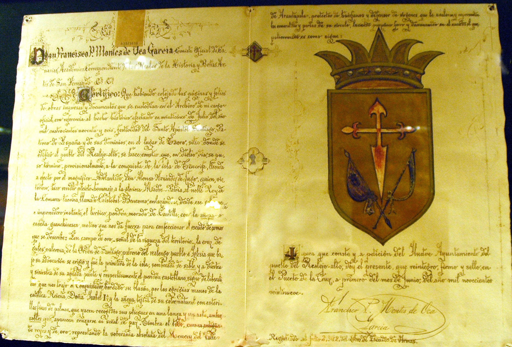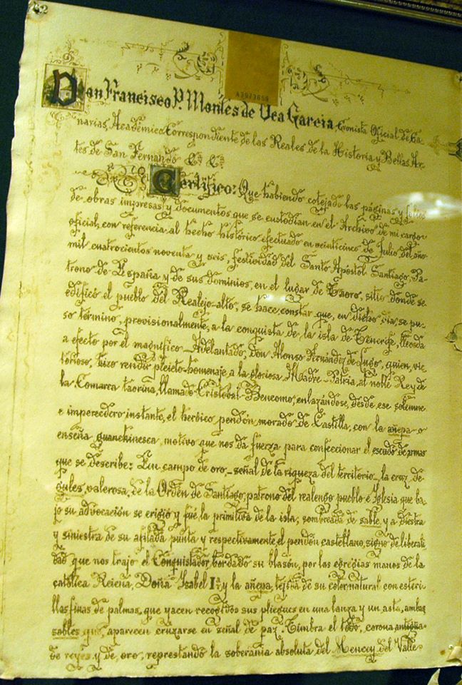 «Don Francisco P. Montes de Oca García, Cronista Oficial de Canarias, académico correspondiente de las Reales de la Historia y Bellas Artes de San Fernandr etc., etc. Certifico: Que habiendo cotejado las páginas y folios de obras impresas y documentos que se custodian en el Archivo de mi cargo oficial, con referencia al hecho histórico efectuado en 25 de Julio del año de mil cuatrocientos noventa y seis, festividad del Santo Apóstol Santiago, Patrono de España y de sus dominios, en el lugar de Taoro, sitio donde se edificó el pueblo del Realejo Alto, se hace constar que, en dicho día, se puso término, provisionalmente, a la conquista de la isla de Tenerife, llevada a efecto por el magnífico Adelantado don Alonso Fernández de Lugo, quien, victorioso, hizo rendir pleito-homenaje a la gloriosa Madre Patria, al noble Rey de la comarca laorina, llamado Cristóbal Bencomo, enlazándose, desde ese solemne e imperecedero instante, el heroico Pendón morado de Castilla, con la añepa o enseña guanchinesca, motivo que nos da fuerza para confeccionar el escudo de armas que se describe: En campo de oro —señal de la riqueza del territorio— la cruz de gules, valerosa de la Orden de Santiago, Patrono del realengo pueblo e iglesia que bajo su advocación se erigió y fué la primitiva de la isla, sombreada de sable y a diestra y siniestra de su afilada punta y, respectivamente el Pendón castellano, signo de liberalidad que nos trajo el conquistador, bordado su blasón por las egregias manos de la católica Reina doña Isabel I y la añepa, tejida de su color natural con esterillas de palma, que yacen recogidas sus pliegues en una lanza y un asta, ambas sable, que aparecen cruzarse en señal de paz. Timbra el todo corona antigua de reyes y de oro. representando la soberanía absoluta del mencey del Valle de Arautapala, protector de huérfanos y defensor de vírgenes que lo avaloran y representan las esmeraldas y perlas de su círculo, luciendo purpúreo forro y descansando en el escudo, el que policromado es como sigue…: Y para que conste y a petición del Ilustre Ayuntamiento del pueblo del Realejo Alto, doy el presente, que reintegro, firmo y ello en el Puerto de la Cruz a primero de Junio del año de mil novecientos veintinueve.