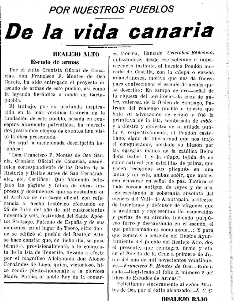 Por el culto Cronista Oficial de Canarias, don Francisco P. Montes de Oca García, ha sido entregado el proyecto de escudo de armas de este pueblo, así como la leyenda heráldica a modo de Carta puebla. El trabajo, por su profunda inspiración en la más verídica historia de la fundación de este pueblo, basada en conceptos altamente patrióticos, ha merecido justísimos elogios de cuantos han visto la obra presentada. He aquí la mencionada descripción heráldica :